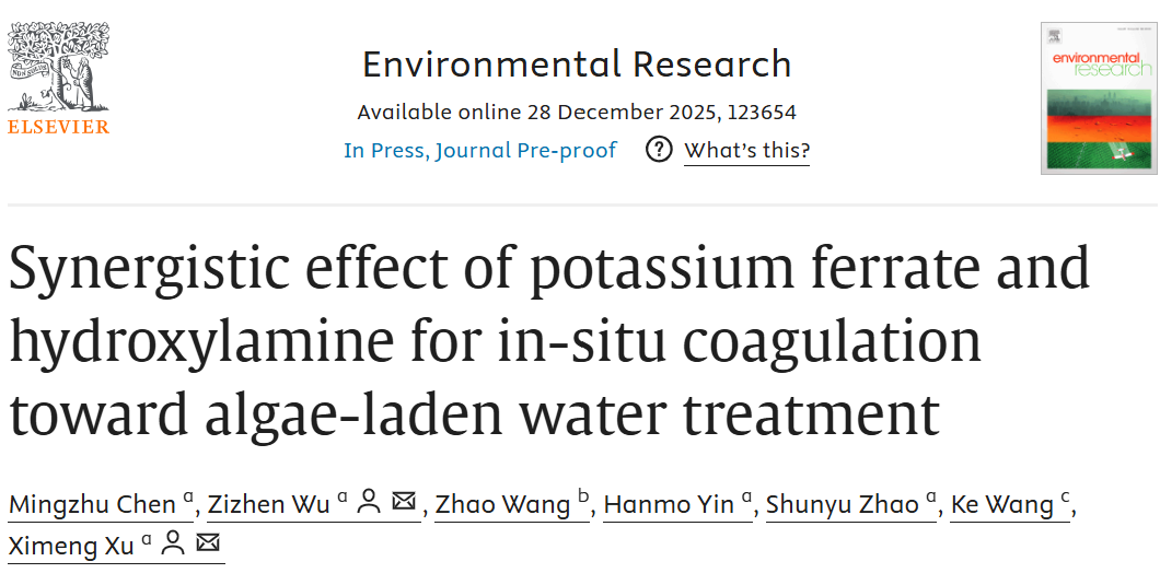 近日,学院2022级给排水科学与工程专业本科生陈明珠同学,在市政工程系吴子祯老师、徐西蒙老师的指导下,针对富藻水处理难题取得了创新性研究成果。该研究以“Synergistic effect of potassium ferrate and hydroxylamine for in-situ coagulation toward algae-laden water treatment”为题,发表在国际知名SCI期刊《ENVIRONMENTAL RESEARCH》(中国科学院二区,IF=7.7)上。