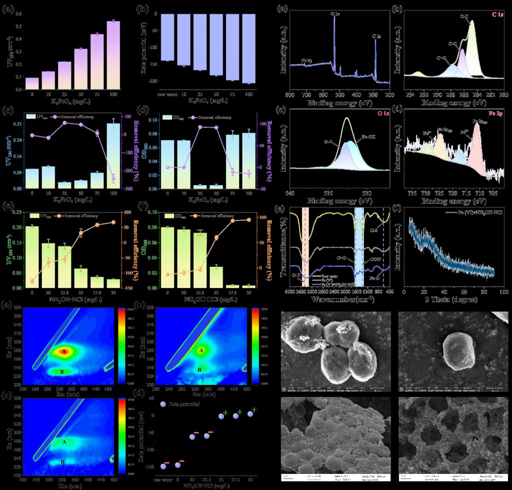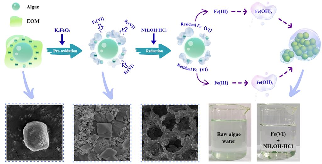 该研究深入揭示了二者的协同作用机制:盐酸羟胺能快速还原剩余高铁酸钾,促进其水解生成具有高吸附活性的无定形氢氧化铁胶体。胶体可有效中和藻细胞表面负电荷,并通过网捕、架桥等作用大幅增强藻细胞的聚集与沉淀性能,从而实现高效、稳定的除藻效果。该工艺具有操作简便、环境友好、残留铁含量低等优点,为湖泊、水库等富藻水体的净化提供了具有广阔前景的新技术路径。